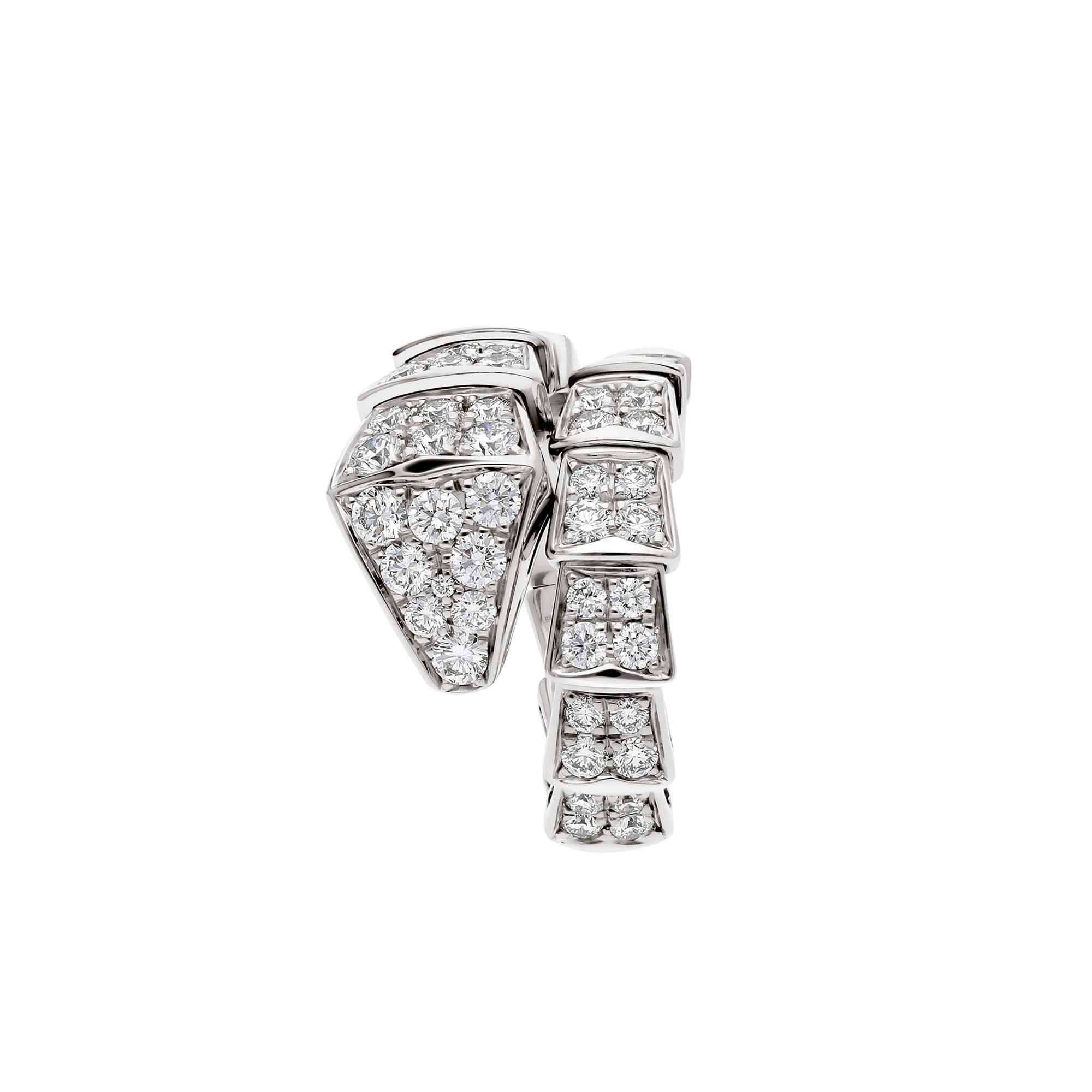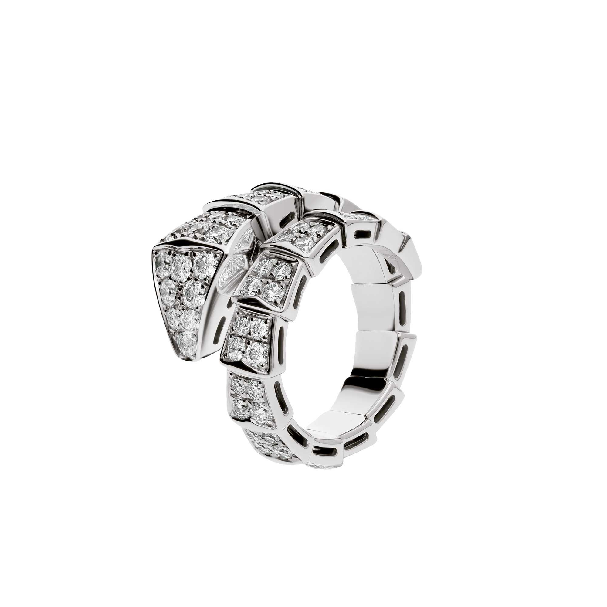 Anello Serpenti Viper in oro bianco 18 kt con pavé di diamanti. Catturando il potere seduttivo del serpente, Bulgari dà vita a una creazione dal design ipnotico e accattivante. Un anello dalle linee sinuose che si avvolge al dito con le sue preziose spire, risplendendo in tutta la sua sofisticata eleganza. Anello Serpenti Viper in oro bianco 18 kt con pavé di diamanti.